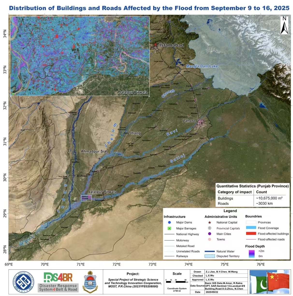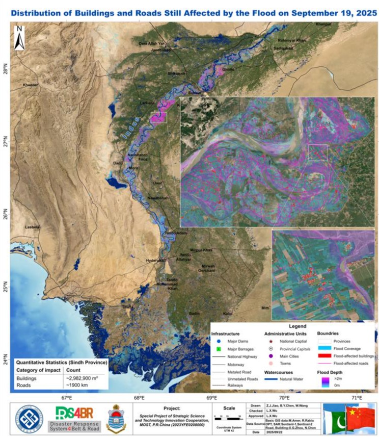 Based on multiple satellite observations on September 19, 2025 and before, we discovered the floodwaters in Sindh and Punjab are now primarily confined within the river/rivers channels, although a small portion of areas outside the channels are also inundated; and no short-term recession of the flood was currently observed. We estimated that in Sindh there are approximately 2,982,900 m² of building area remaining affected by the flooding water, and about 1,900 km of roads are still inundated; while in Punjab there are approximately 10,675,000 m² of building area remaining affected by the flooding water,and about 3,030 km of roads were still inundated. The most severely impacted region in Punjab was located at the confluence of the Jhelum and Sutlej rivers, where extensive villages and roads were submerged, particularly in Jalalpur Pirwala and its surrounding areas. Another area was Ahmadpur Sial and its vicinity, situated at the confluence of the Jhelum and Ravi rivers, which also experienced severe inundation.
